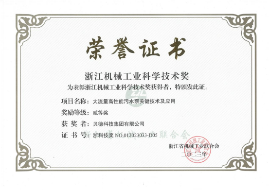 2023年12月,浙江省機械工業聯合會發布了《關于表彰2023年度浙江機械工業科學技術獎獎勵項目的決定》,表彰在機械工業科技工作中作出突出貢獻的單位和人員,共112個項目獲獎,其中一等獎14項、二等獎28項、三等獎70項,貝德科技集團有限公司憑借“大流量高性能污水泵關鍵技術及應用”項目榮獲二等獎!