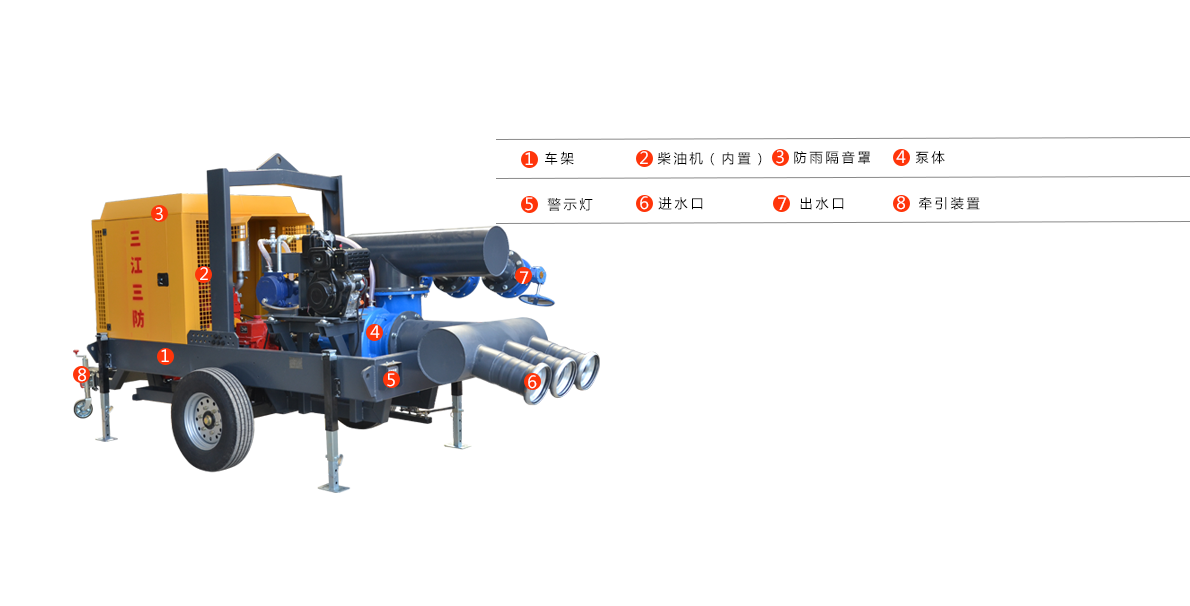 防汛排澇移動泵車采用一臺柴油發動機同軸拖動一臺水泵的一體化設備同時安裝有兩輪或者四輪的實心輪胎以及澳洲標準的牽引裝備,收到險情求助信息后就能快速響應,將泵車連接至汽車上,快速到達受災現場開始排水作業,還能有效解決搶險救災活動中經常遇到的進入困難、作業面狹窄、多種作業并行等多種難題。